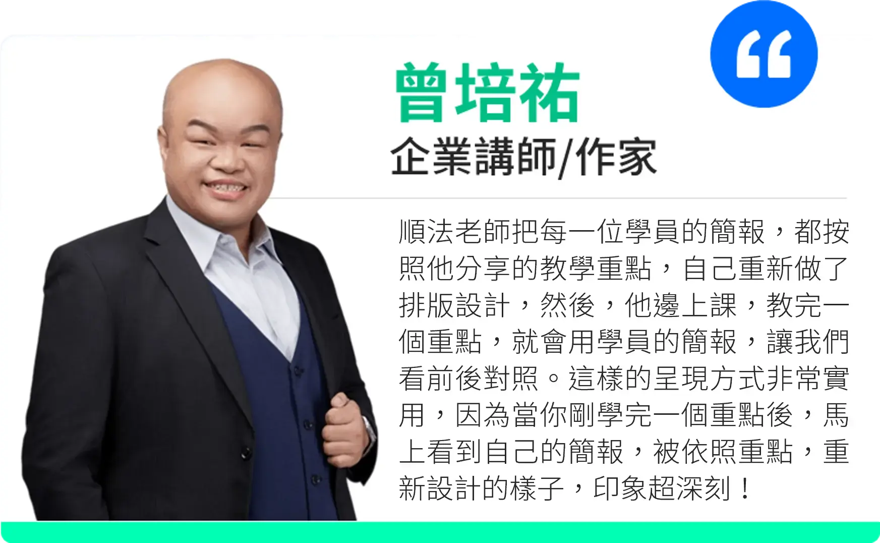 課程以實戰為導向,透過多元且精心設計的案例分析、互動式教學及系統化的架構,幫助學員內化所學,全面提升簡報溝通力與職場競爭力。